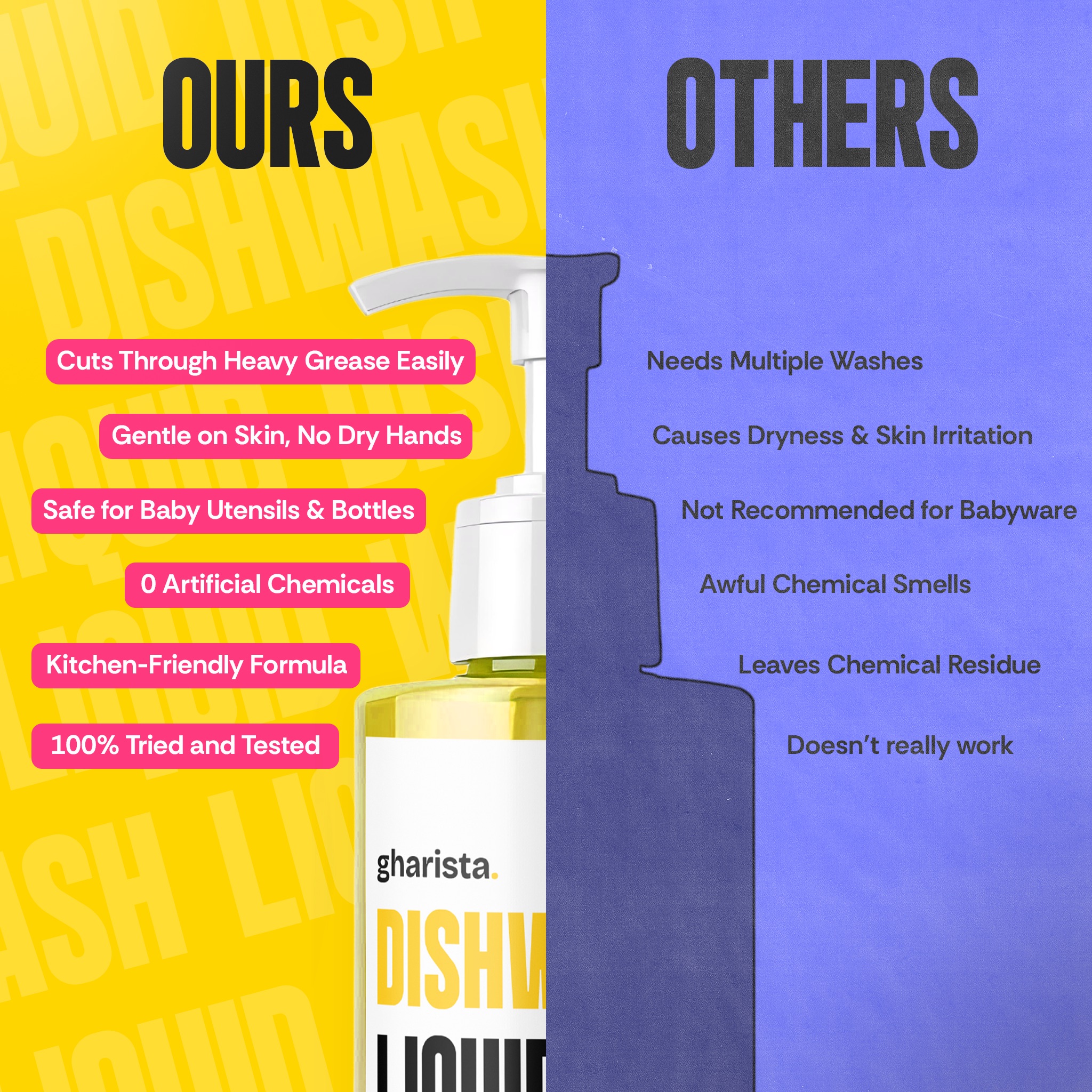 "I cook with lots of oil and ghee. This is the only dishwash that removes it completely in one wash. And my hands don't crack anymore!"